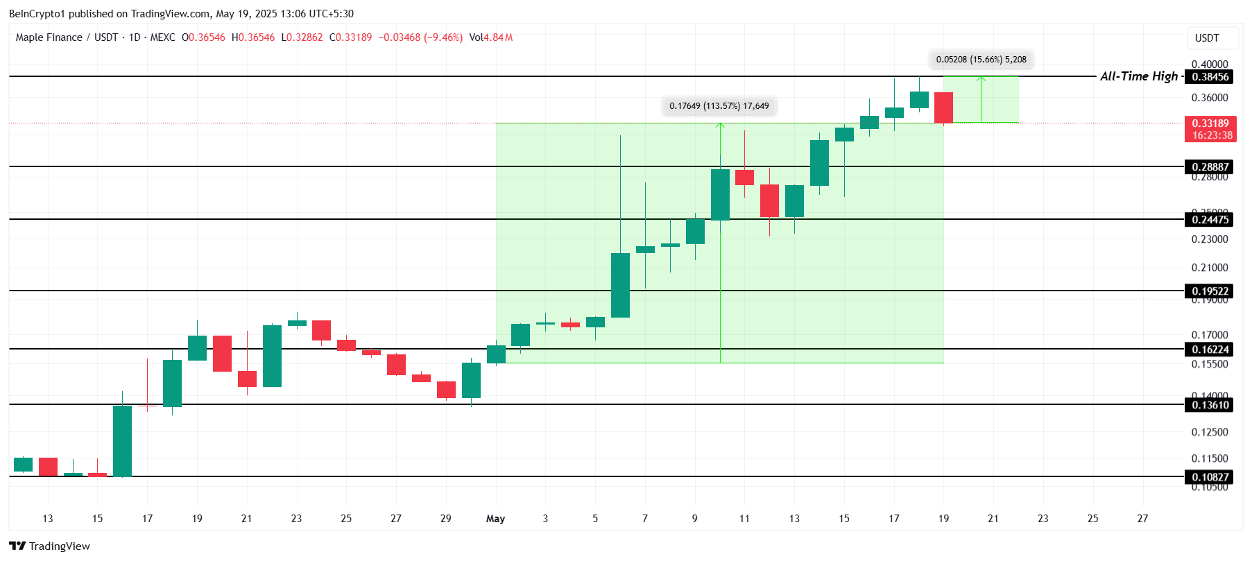 SYRUP wzrósł o 113% w tym miesiącu, handlując na poziomie 0,331 USD i zbliżając się do swojego rekordu wszech czasów. Ta silna wydajność czyni go jednym z najlepiej radzących sobie altcoinów, wskazując na rosnące zainteresowanie inwestorów i impet za ruchem cenowym tokena.
