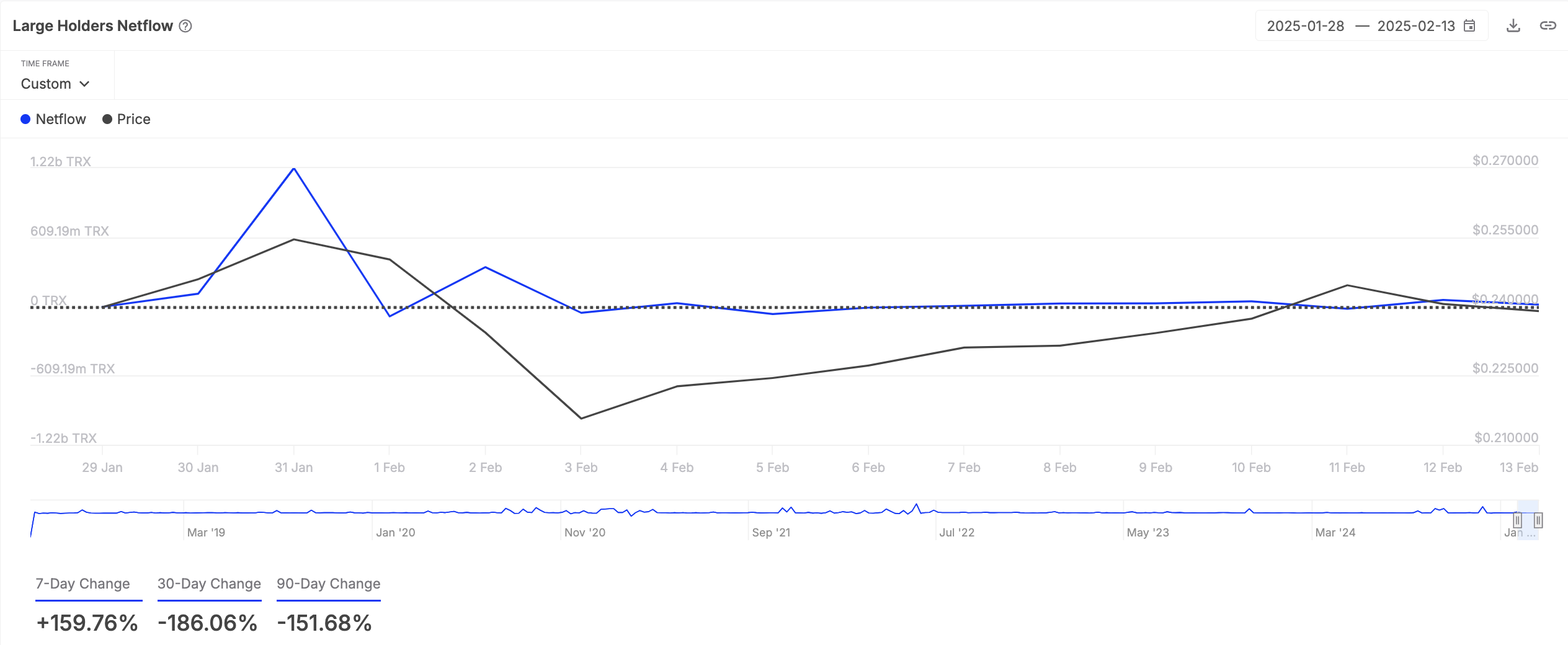 Tron to moneta warstwy L1 (TRX), jest w tym tygodniu na radarze kryptowalutowych wielorybów, co wskazuje jej zwiększony przepływ netto dużych posiadaczy. Według danych z IntoTheBlock, wskaźnik ten wzrósł o 160% w ciągu ostatnich siedmiu dni.