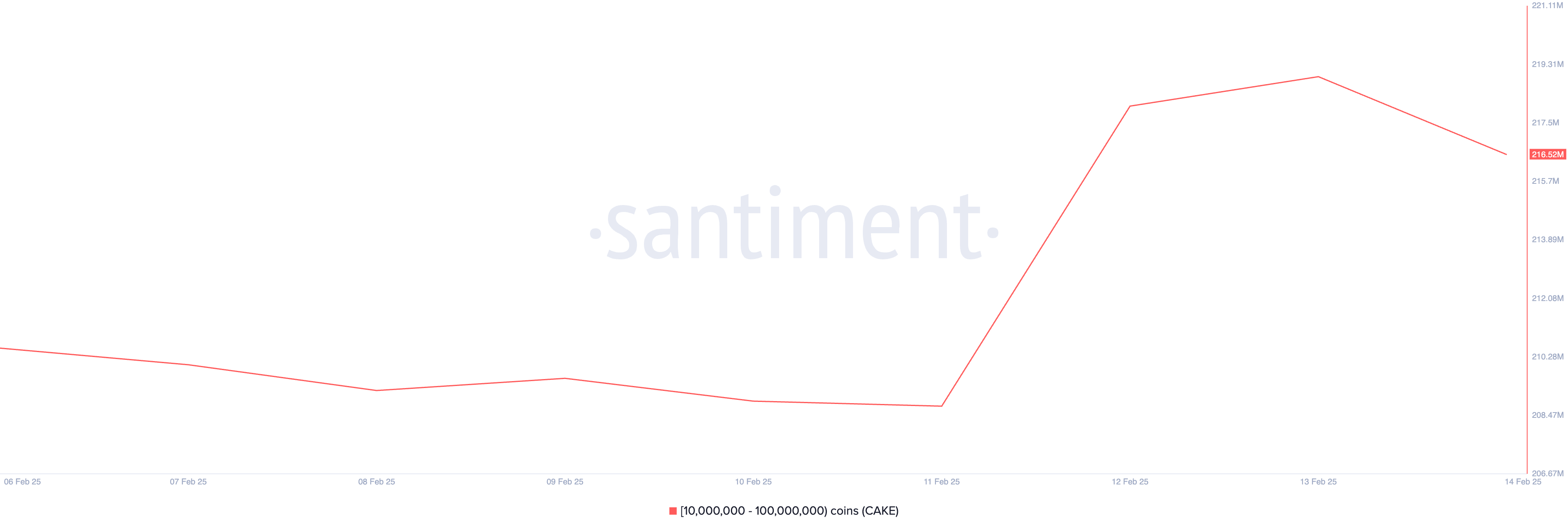 Duże wieloryby CAKE nie pozostały w tyle, ponieważ adresy portfeli posiadające od 10 mln do 100 mln tokenów nabyły 6 mln tokenów w ciągu tygodnia, co jest znaczącym sygnałem odzwierciedlającym panujące nastroje dla tego altcoina.