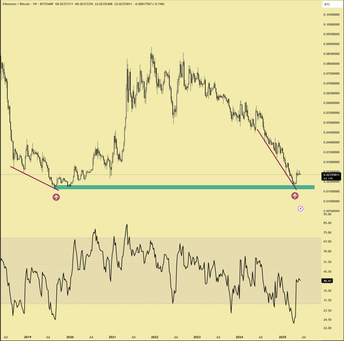 Natomiast trzecim czynnikiem, na który Axel zwraca uwagę, jest to, że stosunek ETH/BTC spadł do najniższego poziomu od sześciu lat. Tygodniowy wskaźnik siły względnej również osiągnął rekordowo niski poziom, sugerując, że ETH jest obecnie wyprzedane. To często sygnalizuje potencjalne odwrócenie trendu i może być zapowiedzią największego wybicia w historii.