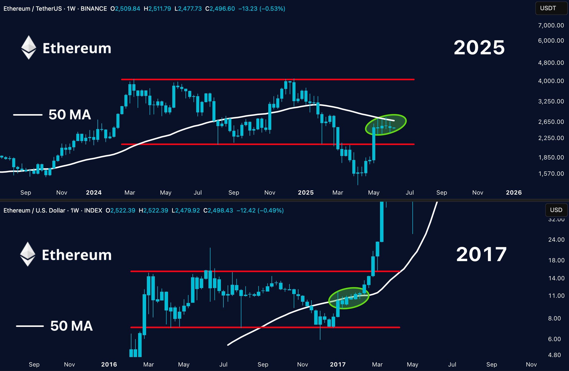 Oprócz analizy Axela Bitblazea, doświadczony trader Merlijn The Trader porównał obecny cykl cenowy ETH do hossy z 2017 roku. Co więcej, jego zdaniem altcoin jest obecnie strukturalnie przygotowany do największego wybicia w historii.