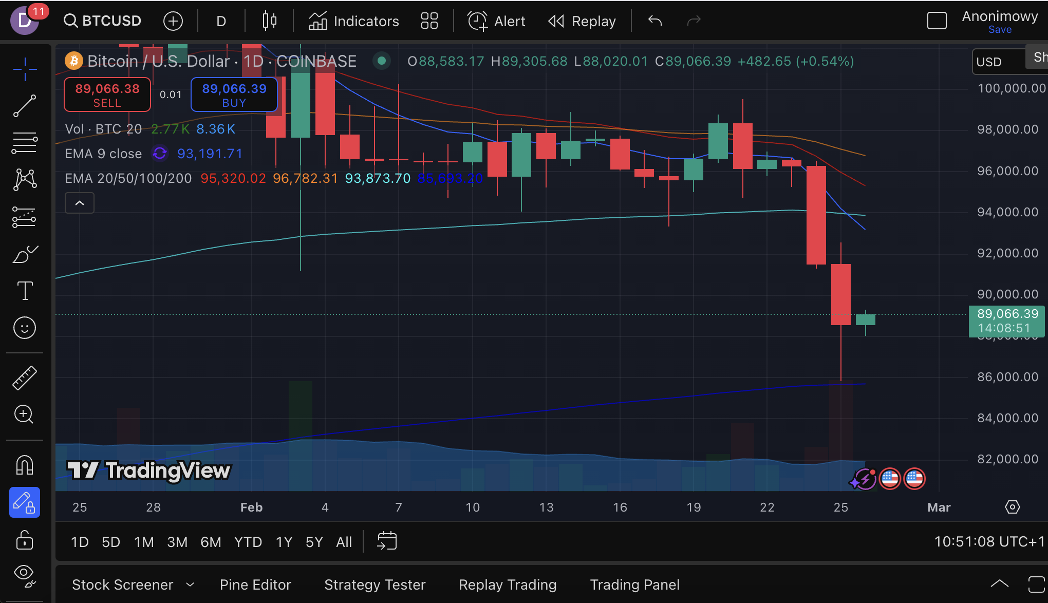 Prognozy Michała Procyka okazały się trafne. Bitcoin faktycznie odbił się od EMA200 i obecnie oscyluje wokół 89 000 USD. Rynek zareagował na ten poziom techniczny zgodnie z analizą.