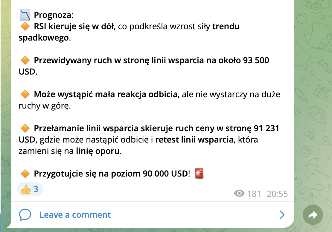 W poniedziałek 24 lutego 2025 roku analityk na kanale Michał Procyk przewidział, że Bitcoin może zejść do poziomu 90 000 USD, gdy cena była jeszcze przy poziomie 95 000 USD. Na zamkniętym kanale napisał: