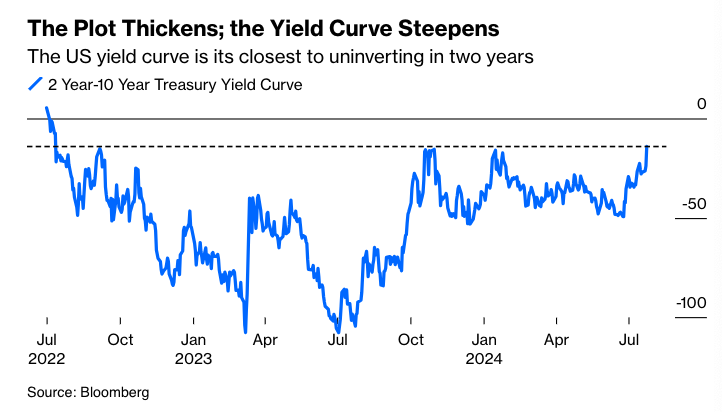 Obecnie widzimy, że inwersja krzywej dochodowości maleje. Oprocentowanie długoterminowych obligacji rządowych rośnie w stosunku do wariantów krótkoterminowych. W całej historii było to często sygnałem początku recesji.