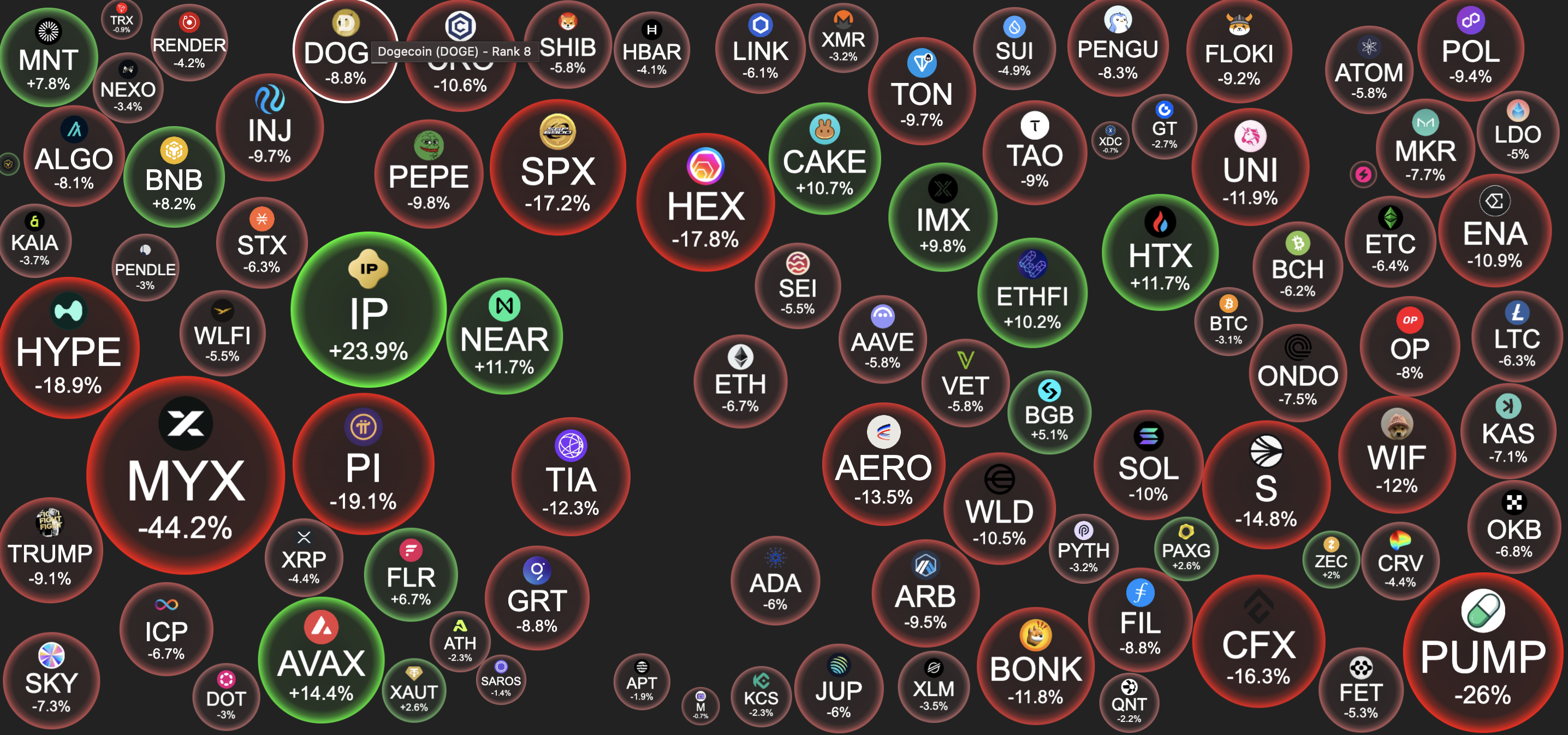 Tymczasem, na dzień dzisiejszy, tydzień wydajności kryptowalut przeważa na czerwono, po masowych likwidacjach traderów na rynkach futures jak i panice, która opanowała niektórych wielorybów.