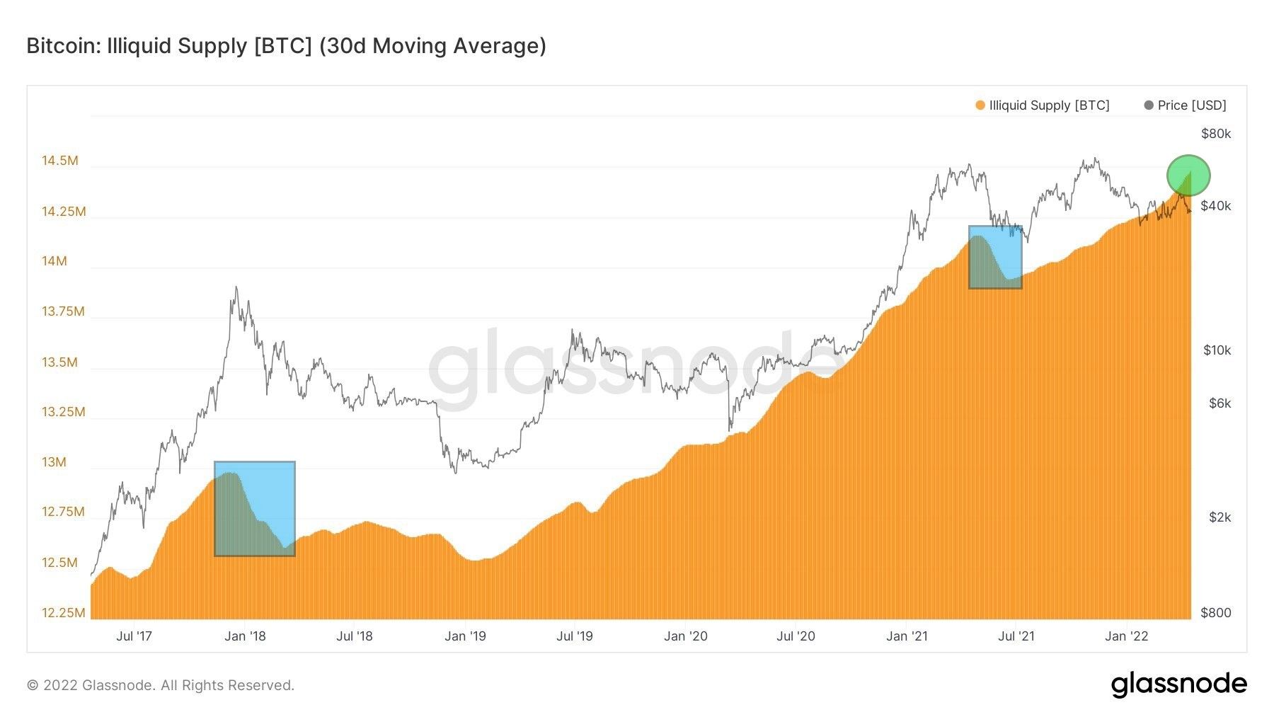 Bardzo ciekawym wskaźnikiem on-chain jest niepłynna podaż (Illiquid Supply) sieci Bitcoin. Mierzy on całkowitą podaż utrzymywaną przez podmioty niepłynne. Płynność lub niepłynność podmiotu definiuje się jako stosunek skumulowanych wypływów i skumulowanych wpływów w całym okresie istnienia podmiotu. Im niższy ten stosunek jest, tym bardziej niepłynny jest podmiot. Innymi słowy taki adres lub UXTO jest zdecydowanie skłonny dłużej przechowywać swoje BTC niż je sprzedawać.