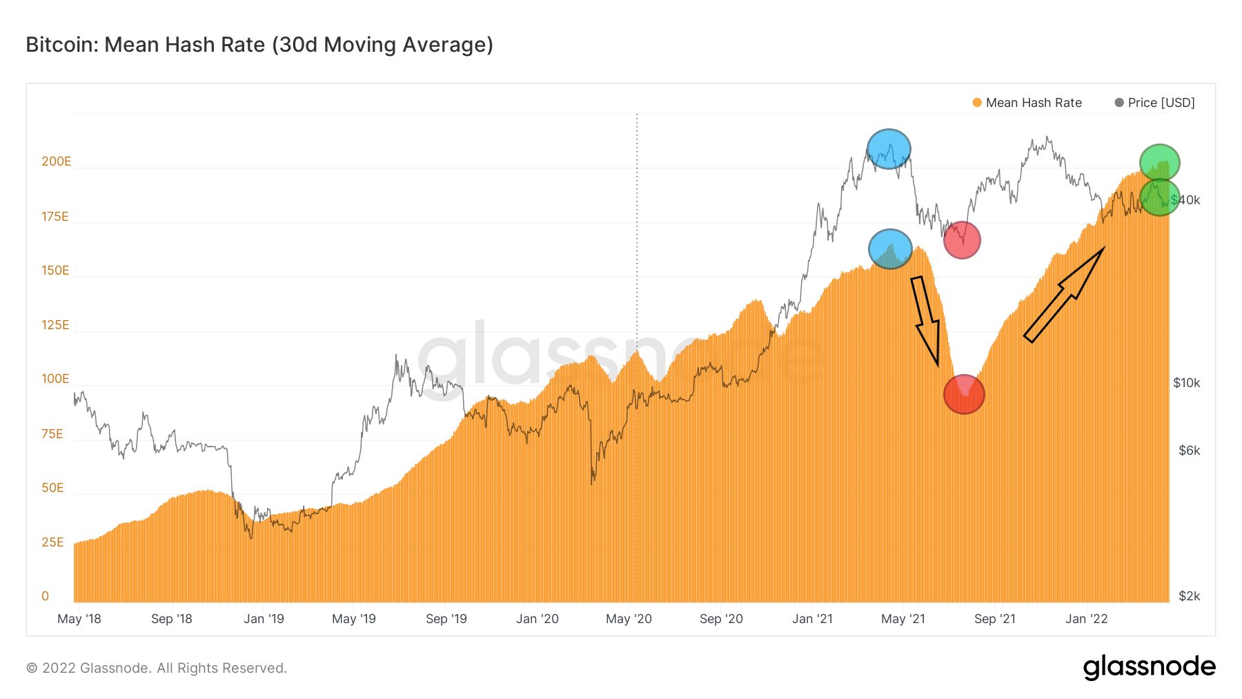 Później hash rate sieci drastycznie spadł, głównie za sprawą exodusu górników z Chin związanych z zakazem kopania kryptowalut w chińskich prowincjach. W dołku z lipca 2021 roku hash rate sieci Bitcoin wynosił zaledwie 95 EH/s, czyli o prawie 43% mniej niż w kwietniowym ATH (czerwone koła).