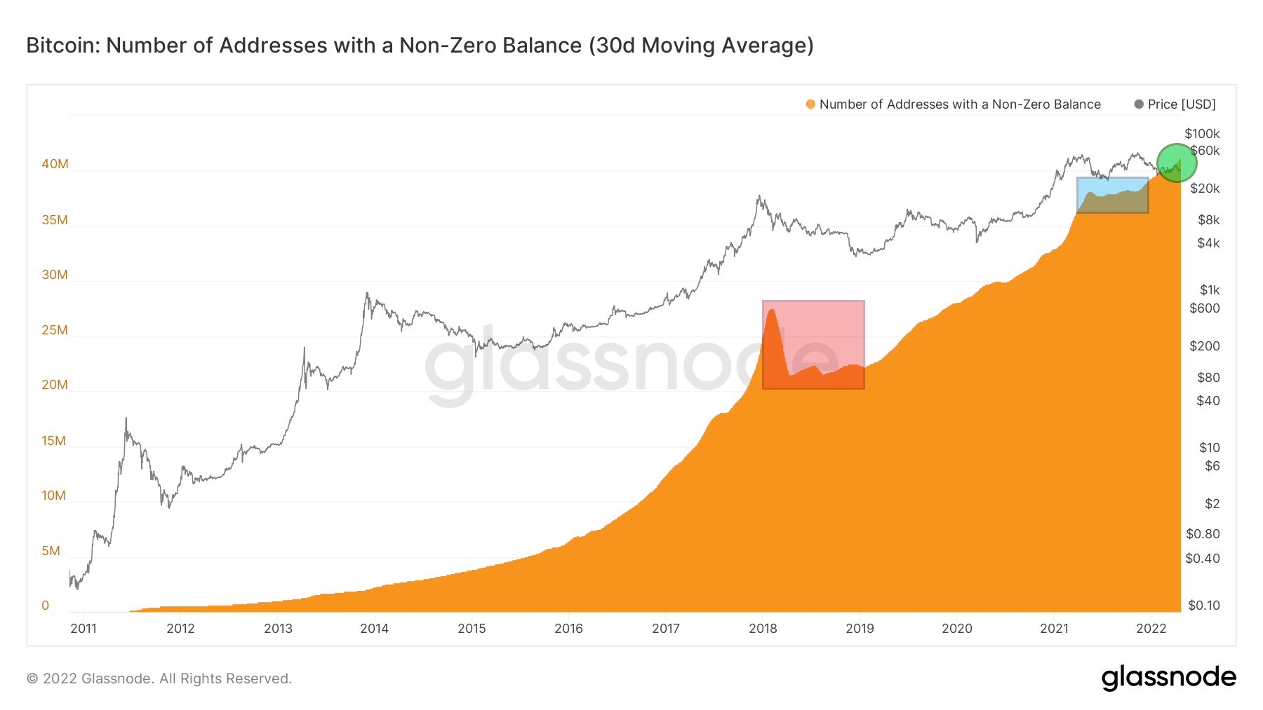 Aktualnie wskaźnik każdego dnia ustanawia nowe ATH. W dniu 19 kwietnia 2022 roku liczba adresów o niezerowym saldzie wynosiła 41 243 796 (zielone kółko). Dlatego jest to kolejny argument na rzecz dynamicznego rozwoju i silnych fundamentów sieci Bitcoin.
