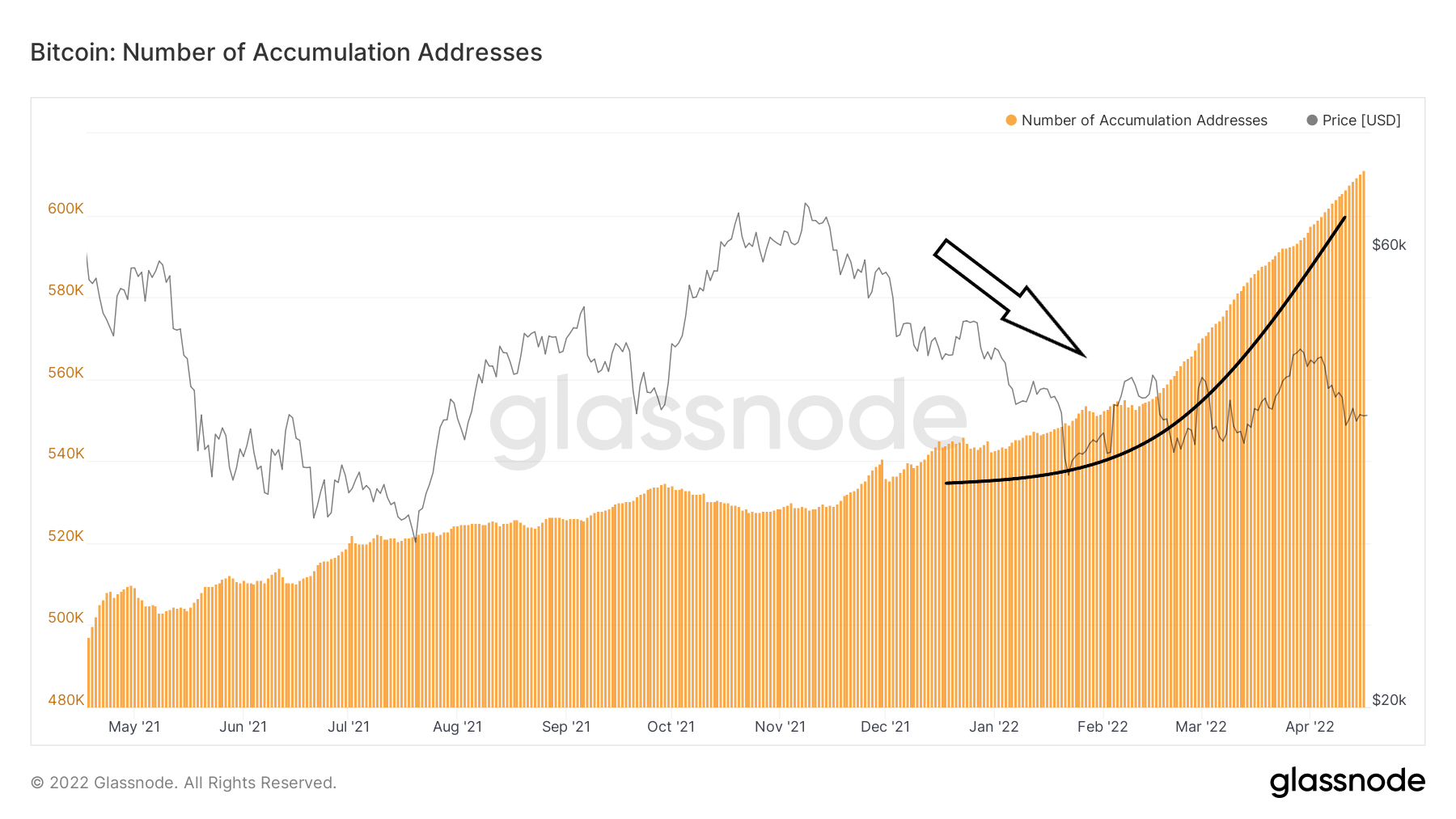 Na wykresie liczby adresów akumulacji, który sięga maja 2021 roku również widzimy w miarę monotoniczny trend wzrostowy. Jednak od połowy lutego 2022 roku – pomimo spadku ceny BTC (strzałka) – wzrost liczby adresów akumulacji gwałtownie przyspieszył i krzywa wzrostu stała się ostrzejsza (czarna linia).