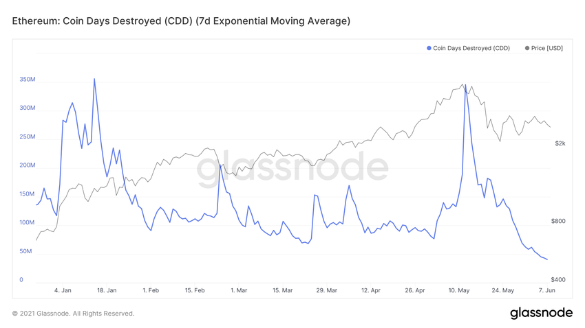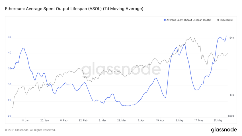 Dane ASOL dla ETH są bardzo odmienne od danych BTC. W dniu 6 czerwca osiągnięty został roczny szczyt na 46,64.