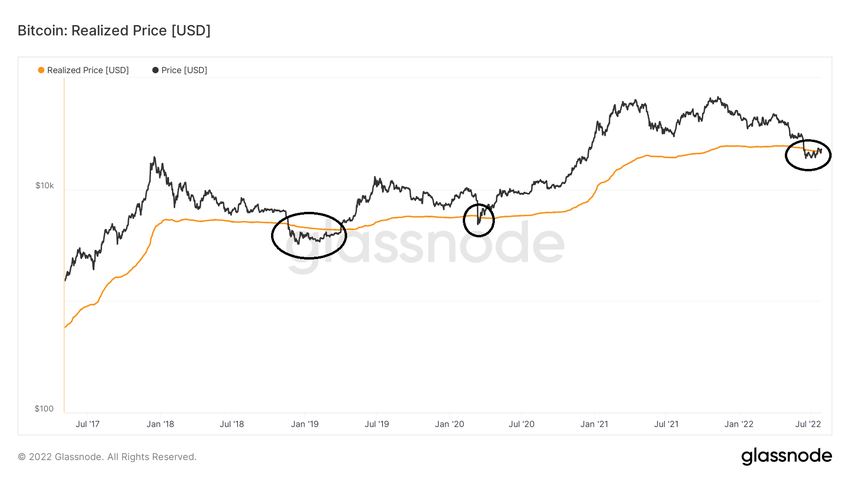 Rzeczywista cena BTC spadła poniżej zrealizowanej ceny tylko trzy razy od 2018 roku. Zrobiła to w lipcu 2018 roku, marcu 2020 roku i lipcu 2022 roku (czarne kółka). Obecnie zrealizowana cena znajduje się na poziomie 21 800 USD. Dlatego, choć BTC spadł poniżej w lipcu, od tego czasu ją odzyskał.