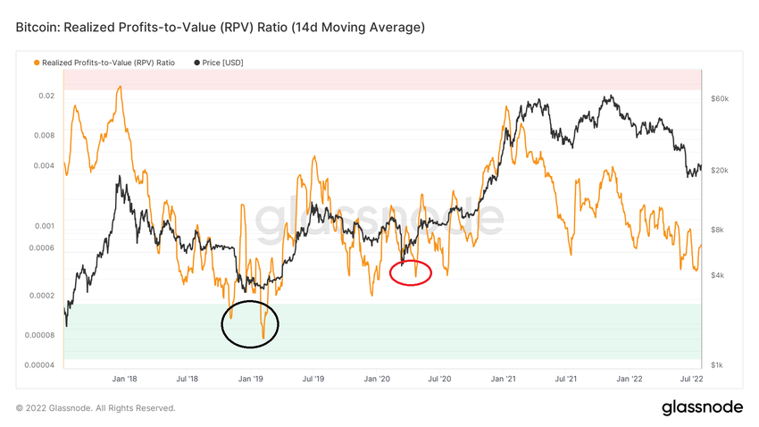 Wskaźnik zrealizowanych zysków do wartości (RPV) to stosunek zrealizowanych zysków do zrealizowanej kapitalizacji. W nim wartości poniżej 0,0002 są uważane za wyprzedane i historycznie były związane z dołkiem. Taka sytuacja miała miejsce w grudniu 2018 roku (czarne kółko).