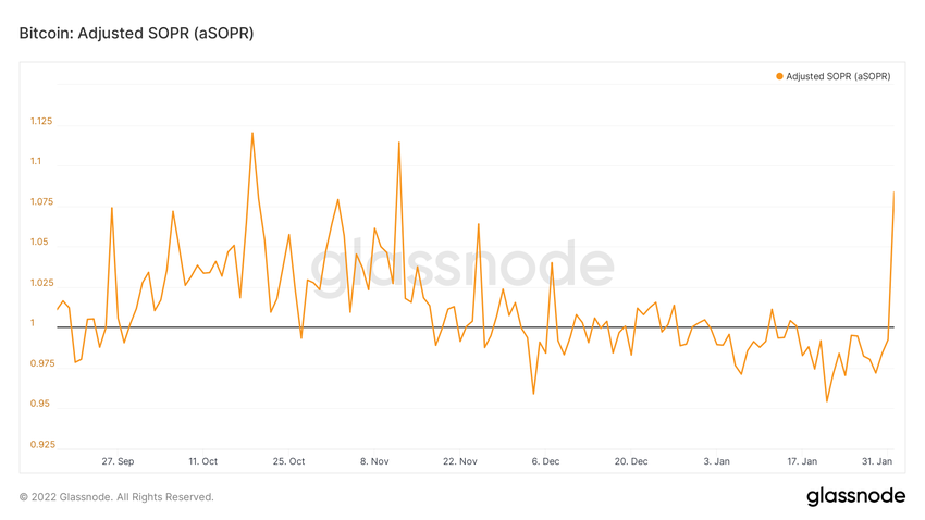 Wreszcie wskaźnik Spent Output Profit Ratio (SOPR) mierzy łączny zysk lub stratę na rynku dla każdego dnia. Wartości powyżej 1 wskazują, że rynek BTC jest w łącznym zysku.