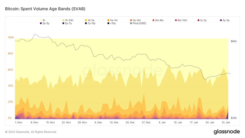Pasma wieku wydanego wolumenu pokazują całkowitą wielkość transferu BTC w oparciu o wiek monety. Obecnie około 90% wolumenu pochodzi z monet, które ostatnio poruszały się 24 godziny temu.