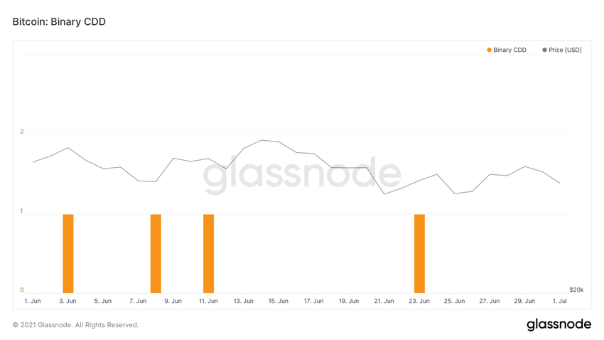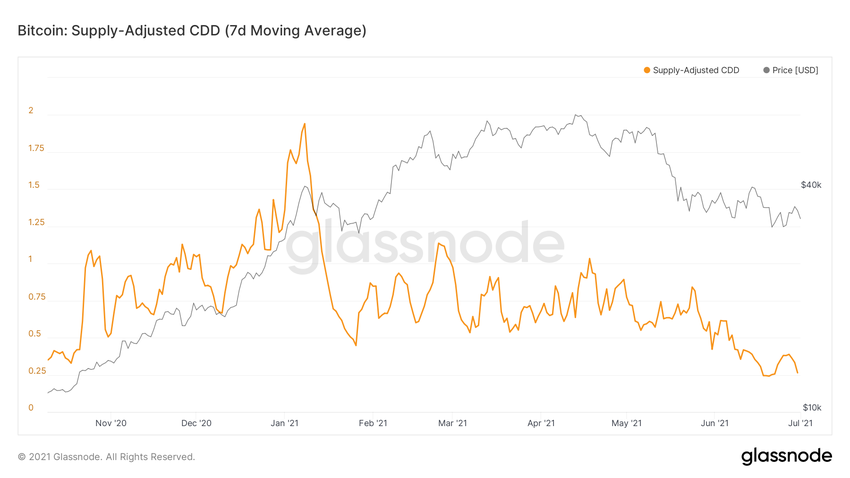 Od 1 czerwca tylko cztery dni miały CDD wyższe niż średnia. Oznacza to, że coraz mniej hodlerów długoterminowych sprzedaje.