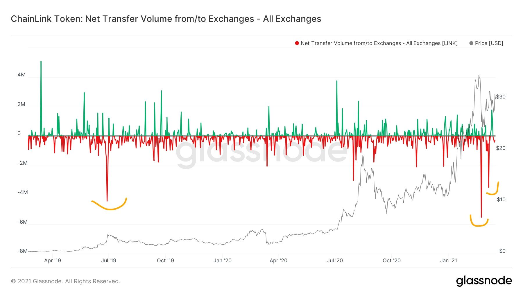 Dodatkowo potwierdza to wskaźnik transferu giełdowego (Net Transfer Volume from/to Exchanges), który w ostatnich dniach odnotował rekordowo wysoki odpływ LINK z giełd. W dniach 23 lutego i 7 marca miały miejsce pierwsza i trzecia największe wypłaty tokena w jego historii.
