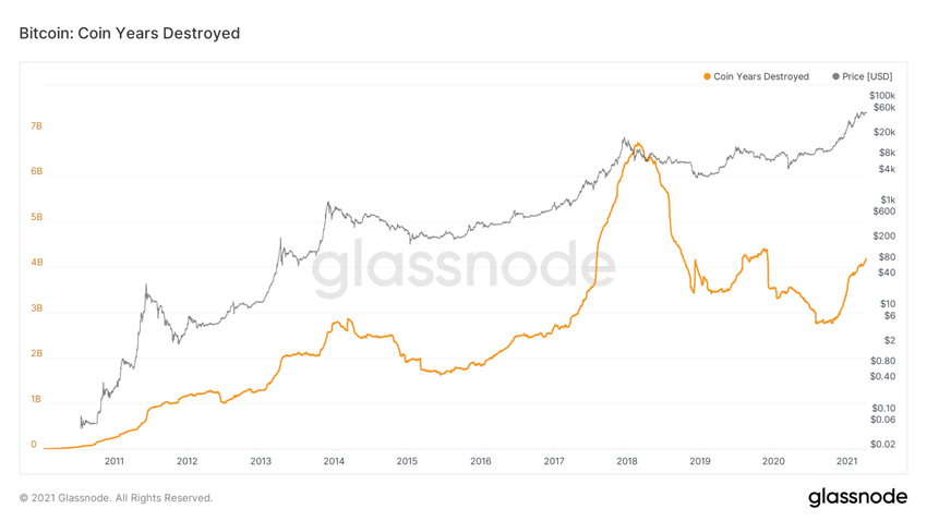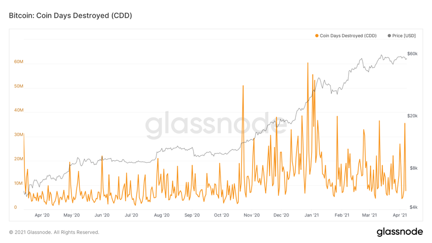 CDD sugeruje, że długoterminowi hodlerzy zrealizowali zyski w pobliżu szczytu na poziomie 40 000 USD w grudniu 2020 roku. Po tym czasie pozostają oni względnie nieaktywni.