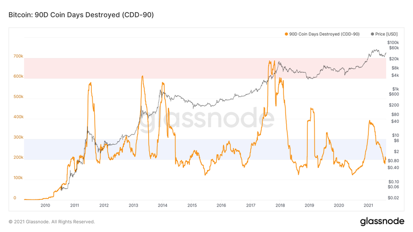 Dodatkowo, podobny odczyt daje wskaźnik 90-dniowej liczby Coin Days Destroyed, który jest sumą kroczącą CDD. Pokazuje on stosunkowo niską wartość 197 975. Jest to wartość poniżej dolnego progu 200 000.