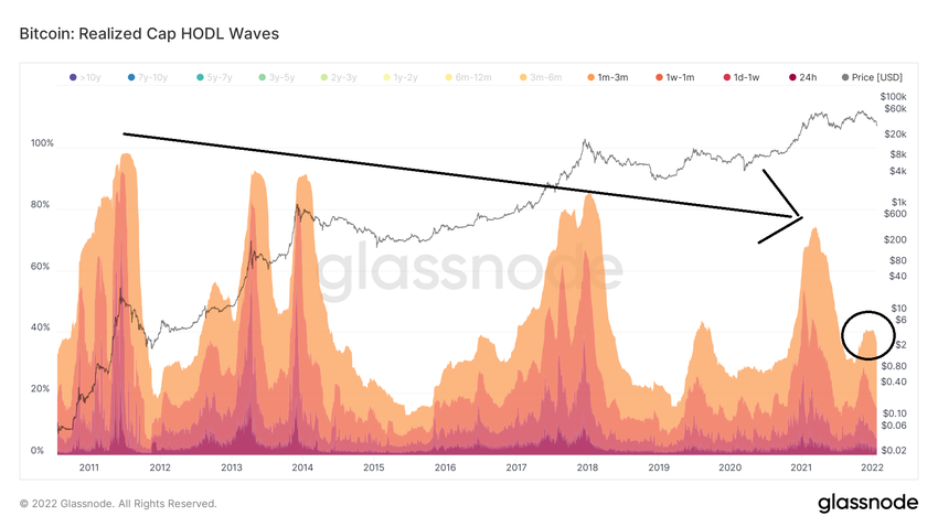 Oznacza to, że większość podaży BTC przesunęła się w ciągu ostatnich trzech miesięcy bardzo blisko szczytów cyklu rynkowego. Jest prawdopodobne, że dzieje się tak w wyniku sprzedaży zasobów przez stare ręce młodym rękom.
