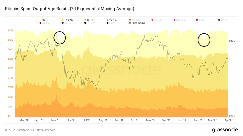 Z kolei ruch od lutego 2021 r. był w większości spowodowany działaniem posiadaczy krótkoterminowych. Z wyjątkiem dwóch okresów (czarne kółka) w maju 2021 r. i lutym 2022 r., ponad 90% transakcji miało swoje poprzednie UTXO utworzone mniej niż miesiąc temu.