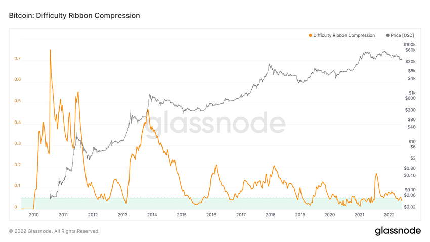 W związku z tym Bitcoin ma więcej miejsca na spadek w zależności od stopnia kompresji wstęgi trudności.