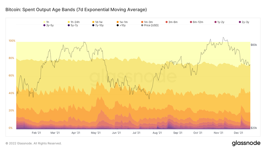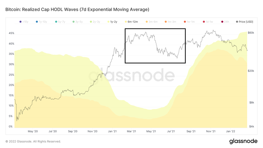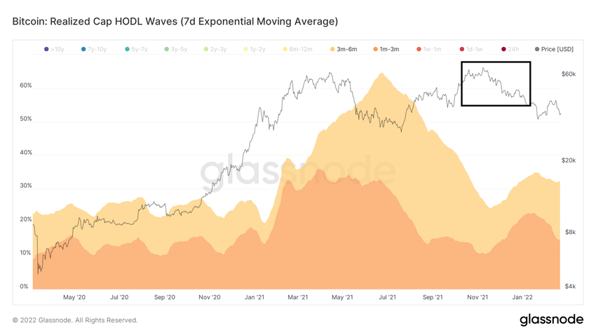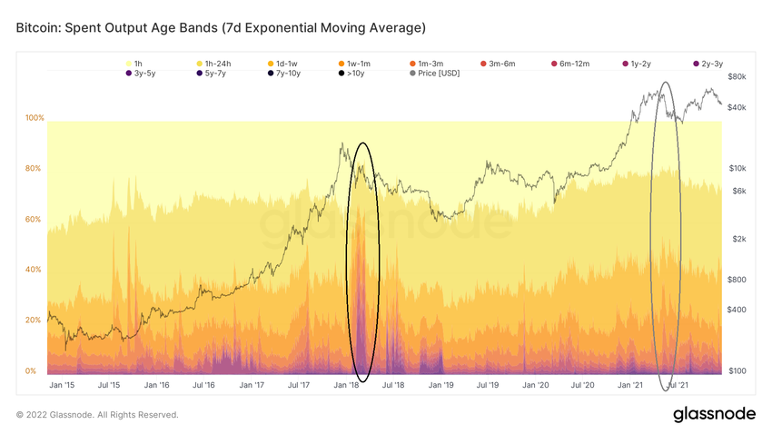 W okresie od października 2021 r. do stycznia 2022 r. cena BTC znajdowała się w zakresie od 43 000 do 67 000 USD. Dlatego te podmioty raczej trzymają ze stratą niż sprzedają.