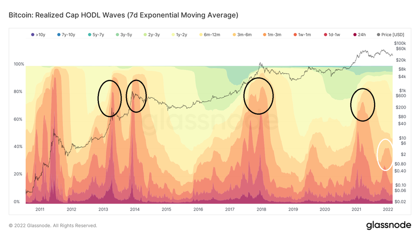 Sponsored SponsoredW przypadku HODL Waves, krótkoterminowe wstęgi rozchodzą się w pobliżu znaczącego szczytu cyklu rynkowego. Było to widoczne w przypadku szczytów cykli rynkowych z 2013, 2018 i 2021 r. (czarne okręgi), ale w mniejszym stopniu w przypadku rekordu wszech czasów z listopada (biały okrąg).