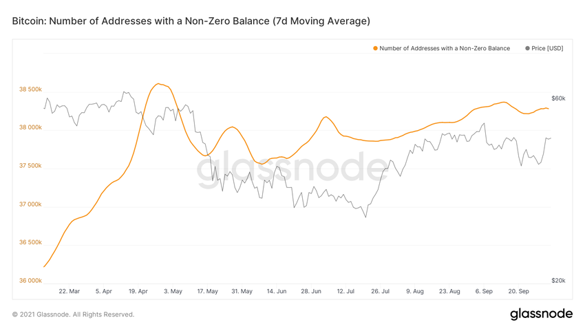 Liczba transakcji BTC wzrasta, ale nadal jest nieproporcjonalna w porównaniu do wzrostu cen. Z drugiej strony, liczba adresów z niezerowym saldem zbliża się do nowego rekordu wszech czasów (ATH).
