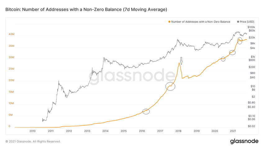 Liczba niezerowych adresów BTC dostarcza innej perspektywy w porównaniu z liczbą transakcji. Wartość ta nadal rosła od szczytu z 2017 roku i osiągnęła nowy rekord wszech czasów mniej więcej w tym samym czasie, w którym zrobiła to cena BTC.