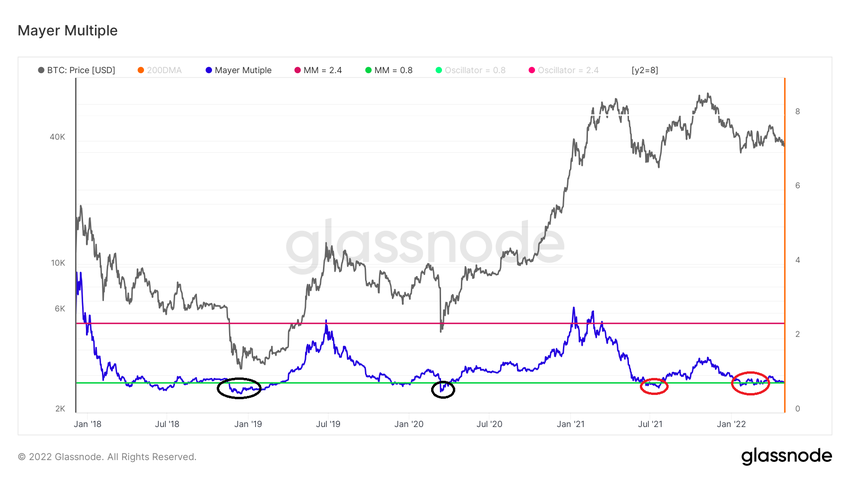 W bieżącym ruchu Mayer Multiple spadł poniżej swojego oscylatora 0,8 w lipcu 2021 r. (czarne kółko). Następnie do lutego 2022 r. znajdował się powyżej tego oscylatora. Ta część ruchu nie jest podobna do tej z 2018 roku.