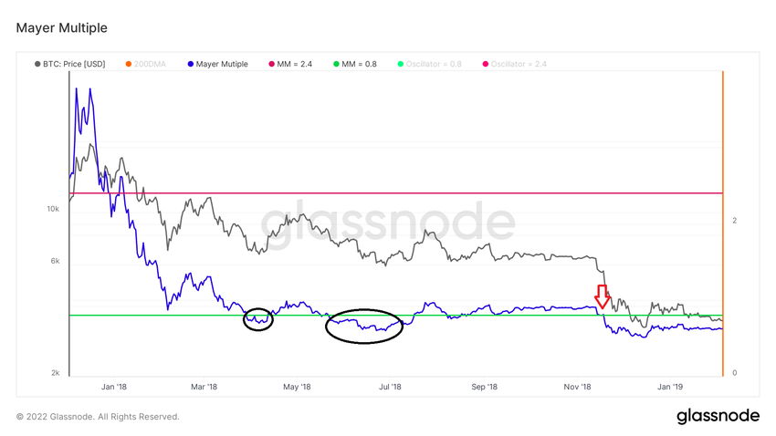 Mayer Multiple znajduje się obecnie poniżej oscylatora 0,8. Jak widać powyżej, wskaźnik ten historycznie wskazuje na to, że cena jest w trakcie osiągania dna.