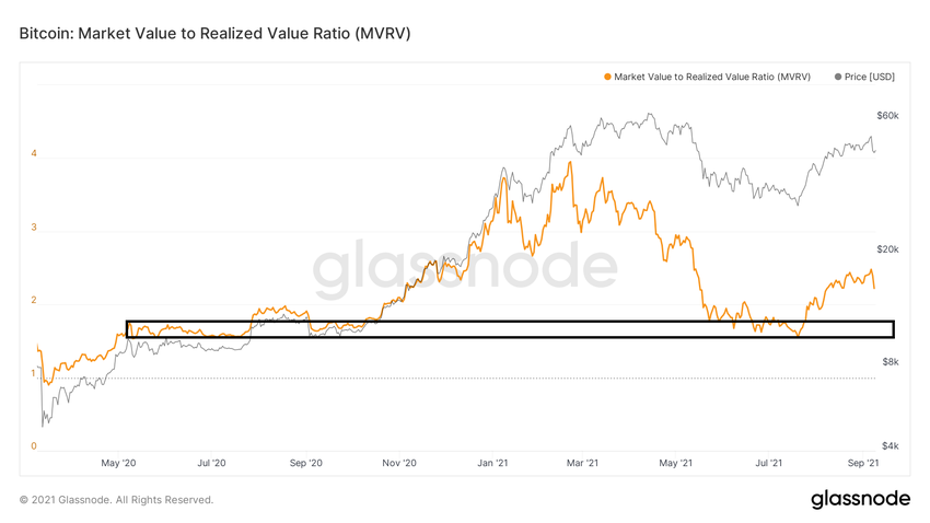 Wartość MVRV jest stosunkiem pomiędzy kapitalizacją rynkową BTC a kapitalizacją zrealizowaną. Dlatego też wartość 2 sugeruje, że kapitalizacja rynkowa jest dwa razy większa niż zrealizowana.
