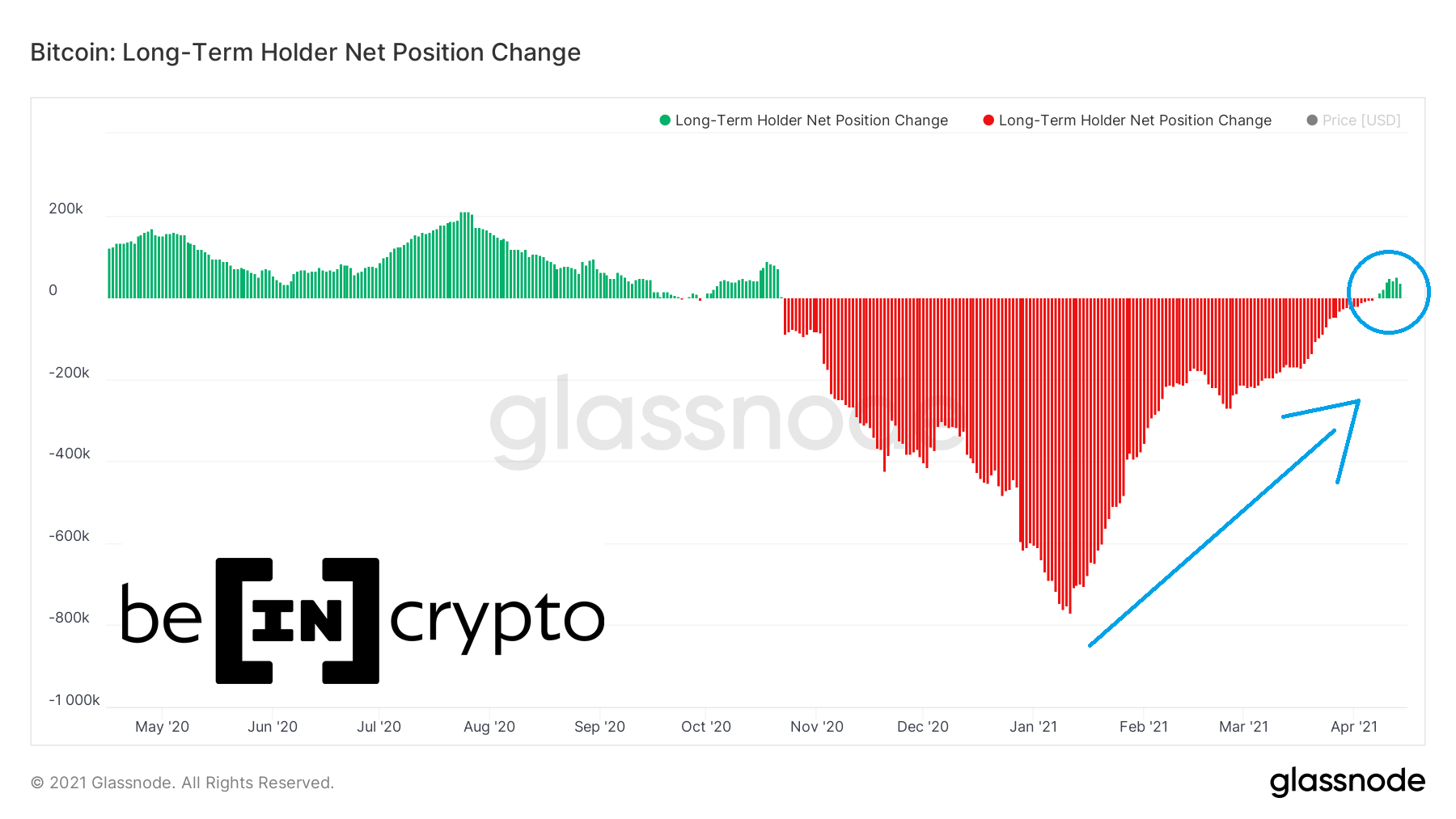 Pierwszym wskaźnikiem analizy on-chain, który ukazuje wyraźną zmianę zachowania długoterminowych inwestorów, jest Long-Term Holder Net Position Change. Od stycznia 2020 obserwujemy zdecydowany spadek ich aktywności sprzedażowej (niebieska strzałka).