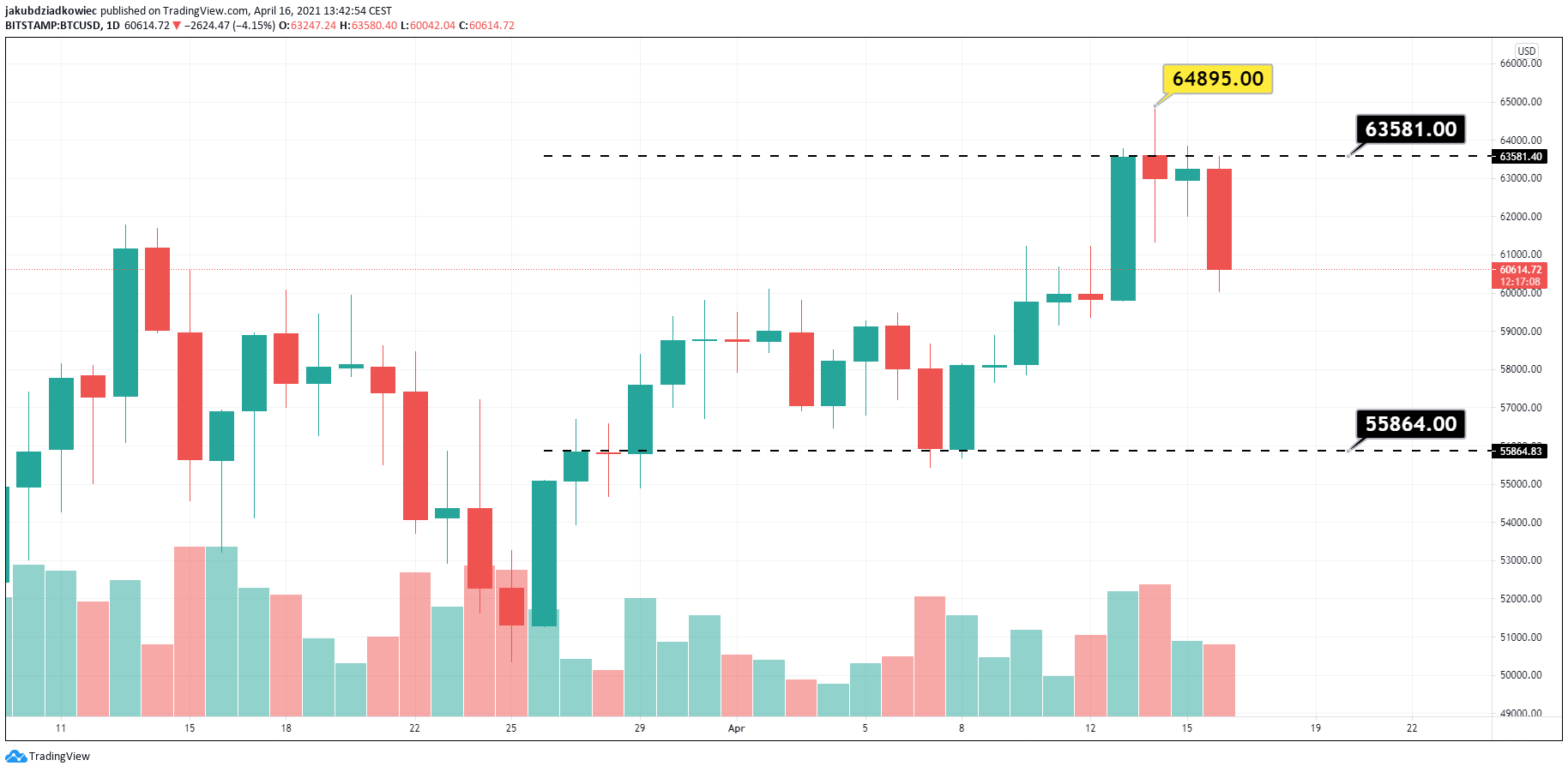Bitcoin osiągnął nowy rekord wszech czasów na 64 895 USD w dniu 14 kwietnia. Aktualnie trwa korekta i próba zatwierdzenia poprzedniego obszaru wybicia jako wsparcia.
