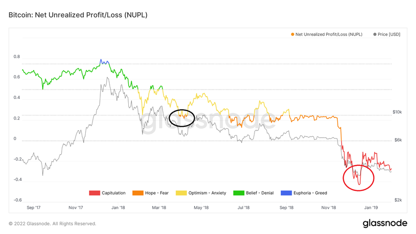 W 2014 r. dno zostało osiągnięte dziewięć miesięcy po tym, jak NUPL spadł poniżej 0,25. W 2018 r. dno zostało osiągnięte osiem miesięcy po tym, jak NUPL po raz pierwszy spadł poniżej 0,25.