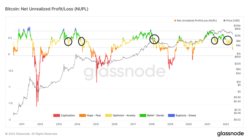 Poprzednie wybicia są zazwyczaj znakiem, że rozpoczął się niedźwiedzi trend, a NUPL pochodzi z linii 0,5. Historycznie, kiedy wskaźnik przecina linię powyżej, kolejne znaczące przecięcie poniżej sugeruje, że rozpoczął się niedźwiedzi cykl rynkowy.