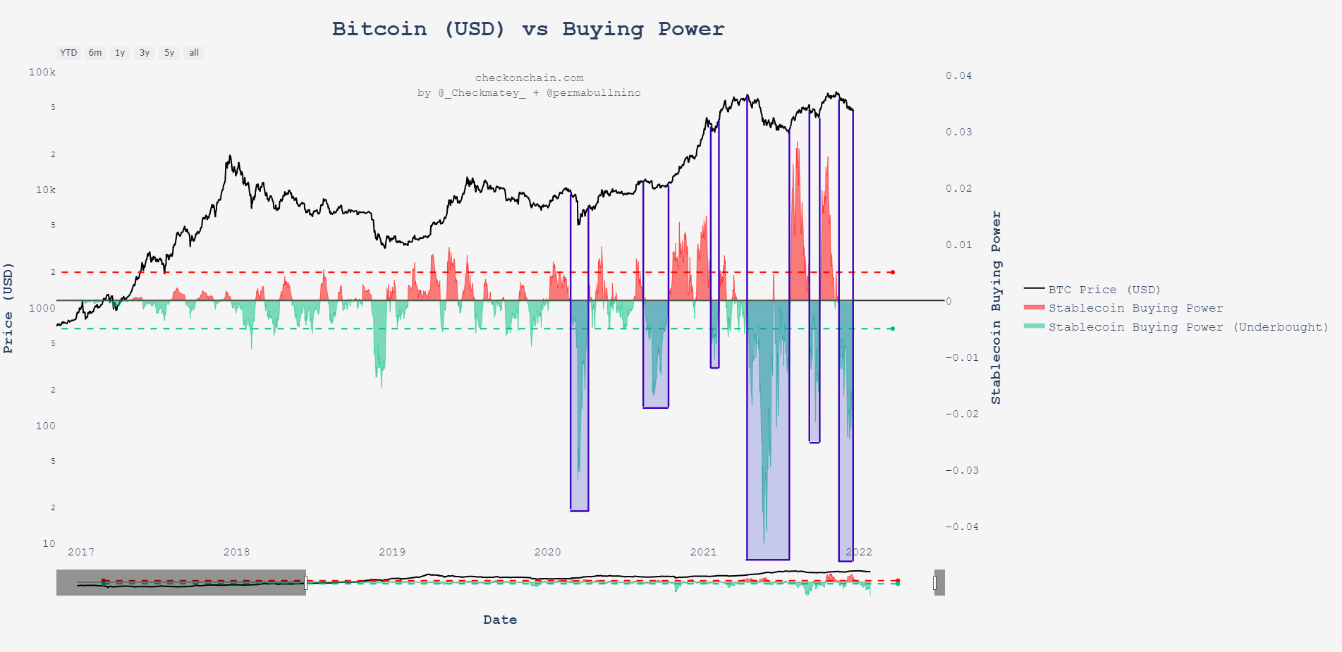 Znaczenie zielonego obszaru z powyższego wykresu podkreśla też analogiczny wykres siły nabywczej stablecoinów przygotowany przez dwóch analityków on-chain @_checkmatey_ i @permabullnino. Na długoterminowym wykresie widzimy zielone słupki, które wskazują na obszary, gdzie rosła siła nabywcza stablecoinów.