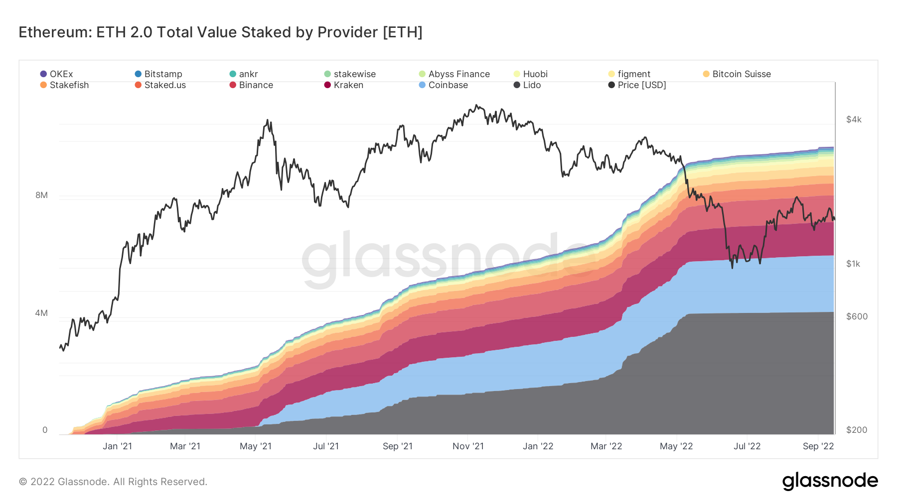 Są to zdecentralizowana platforma Lido (4,17 mln ETH) oraz 3 duże, scentralizowane giełdy kryptowalutowe: Coinbase (1,92 mln ETH), Kraken (1,14 mln ETH) oraz Binance (905 tys. ETH). Natomiast całkowita ilość stakowanego ETH to 13,7 mln.