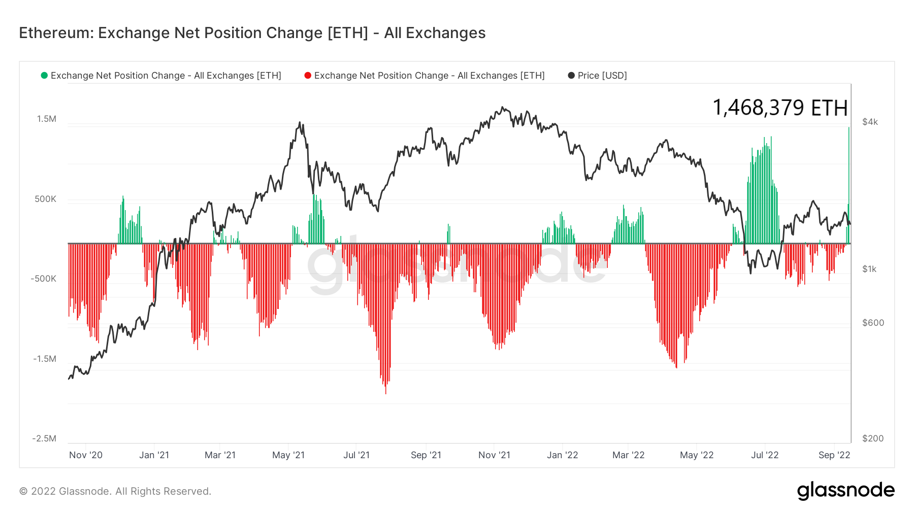 W trakcie gdy aktualizacja Merge wchodziła w życie na giełdy napłynęła rekordowa ilość ETH. Według danych od Glassnode na giełdy przesłano prawie 1,5 mln ETH w zaledwie 24h – dokładnie 1,469,379 ETH. Ostatni raz tak duże napływy ETH na giełdy notowano w lutym 2019 roku, czyli 3,5 roku temu.