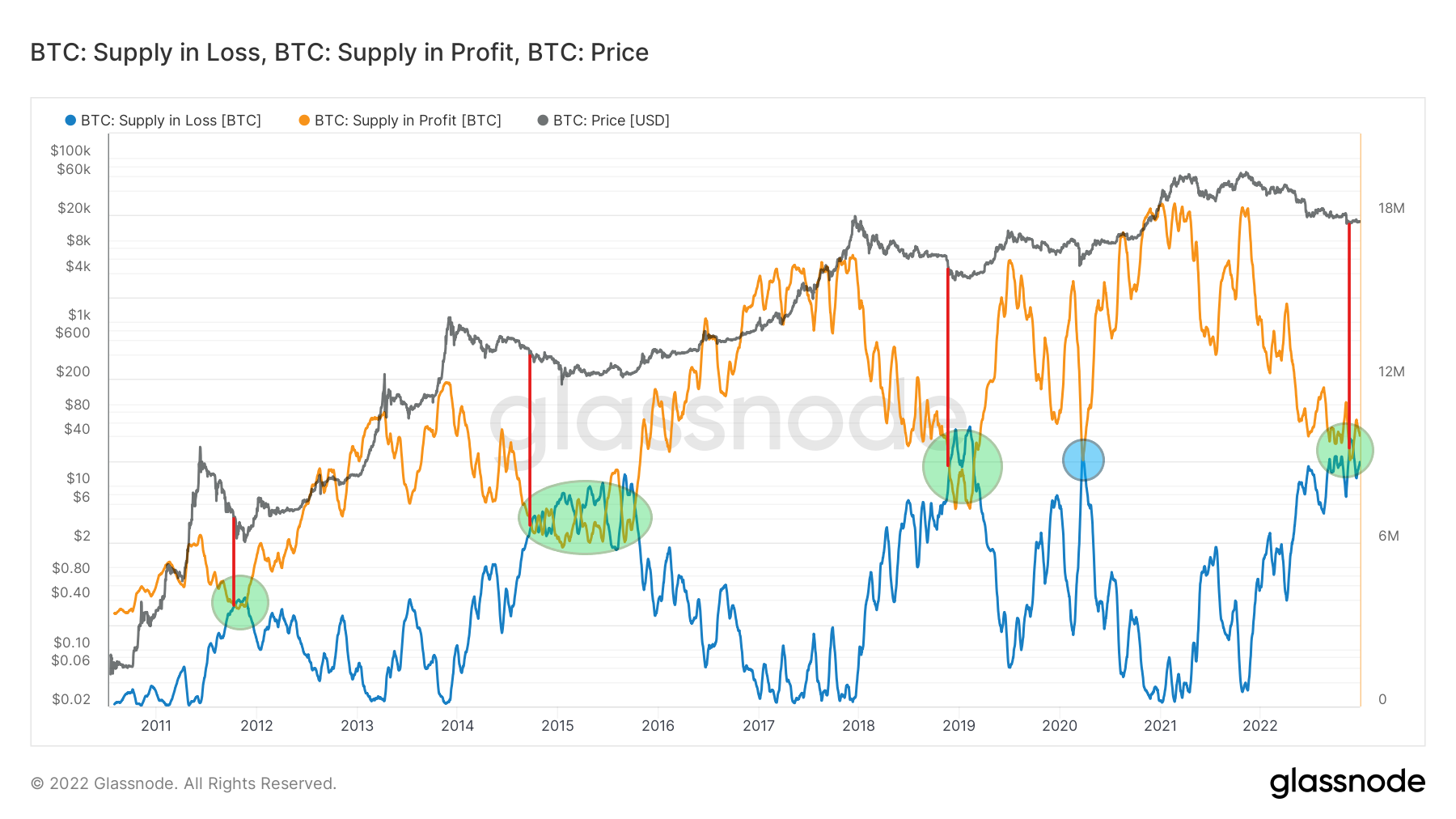 - 21 listopada 2022 roku – dołek na 8,588 mln BTC, dołek ceny BTC na 15 797 USD (zielona)
