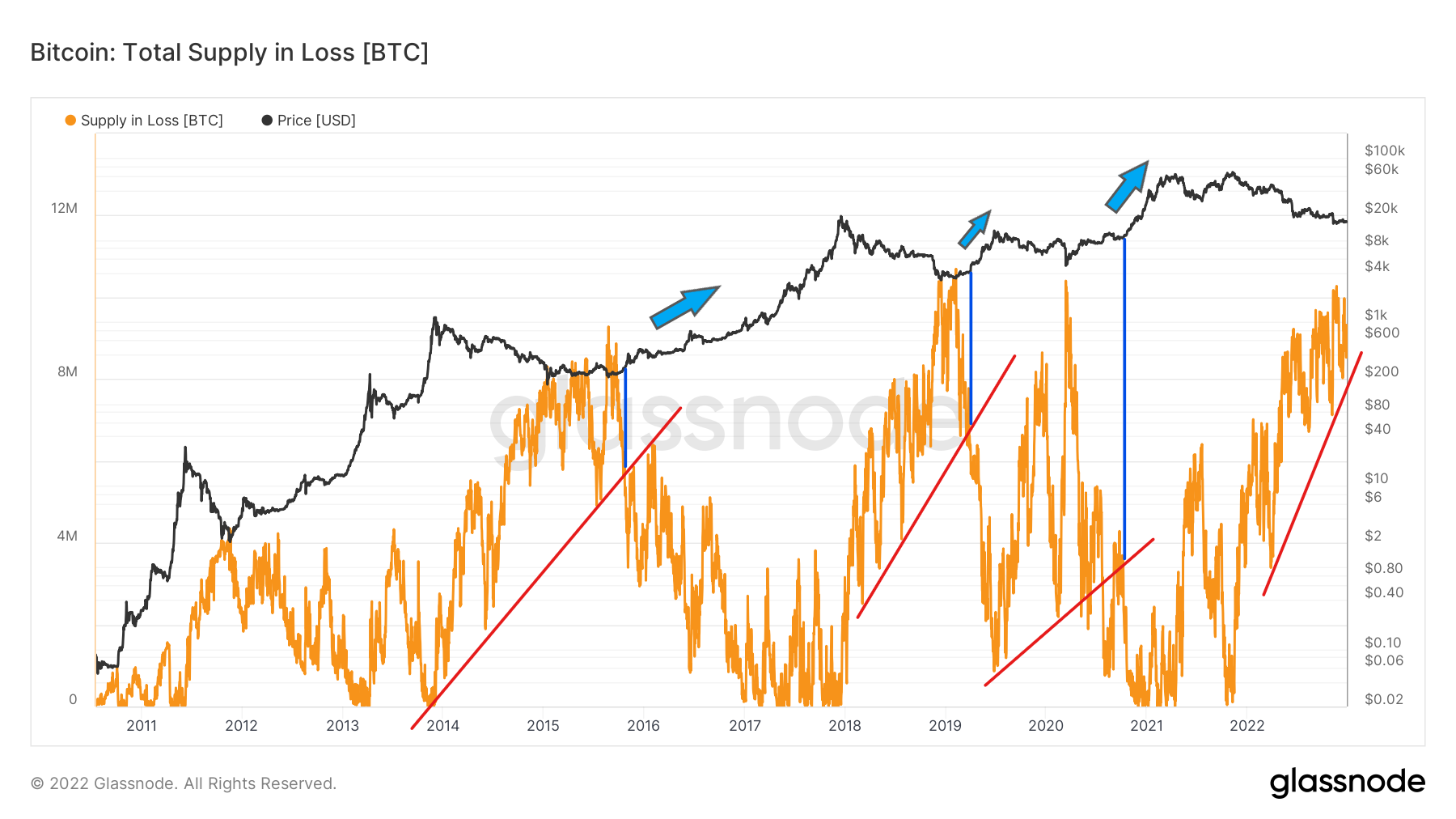 Innego spojrzenia na wykres podaży w stracie dostarczają jej długoterminowe trendy. W poprzedniej sekcji powiedzieliśmy, że wzrosty tej metryki korelowały z spadkiem ceny BTC, niedźwiedzimi cyklami i następującą później akumulacją.