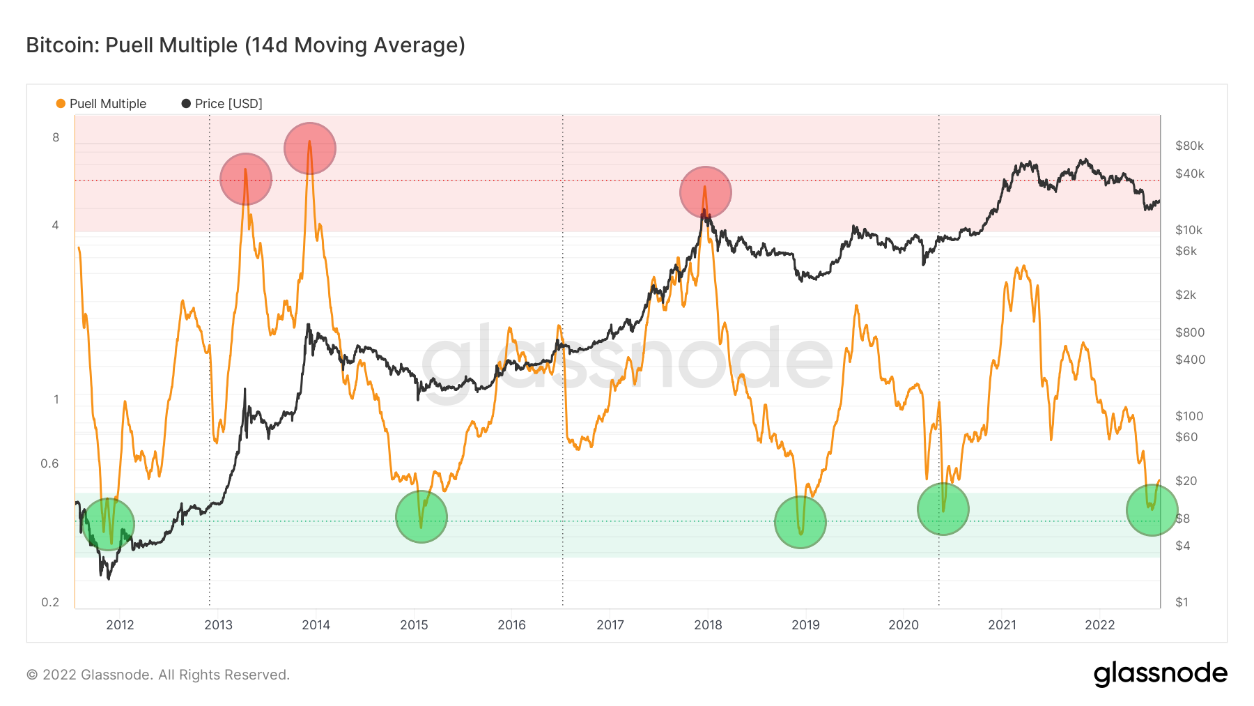 Jednak Puell Multiple spadł do wyprzedanego obszaru dopiero kilka tygodni później (zielone kółko). Bitcoin był już wtedy w tracie „V-shaped recovery”, rosnąc o około 150% i doprowadzając wskaźnik do wybicia z zielonego wyprzedania. Podobną sytuację obserwujemy dzisiaj.