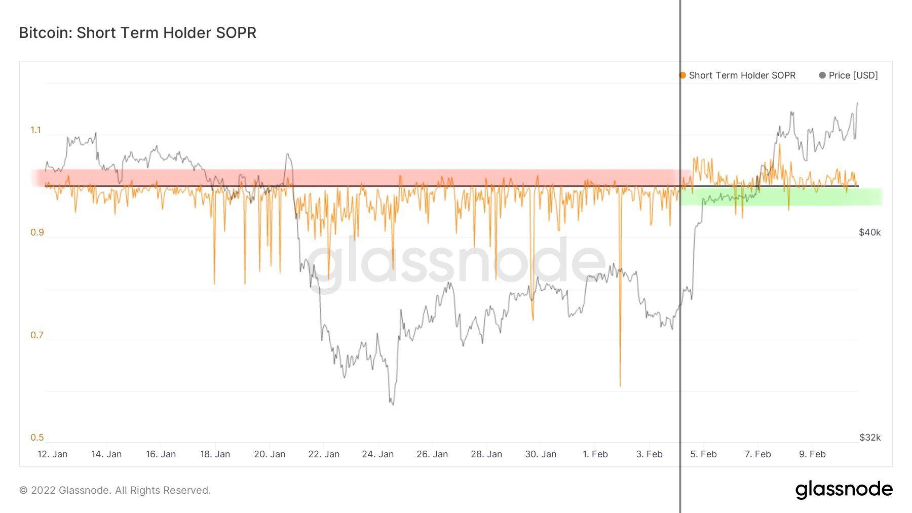 Dopiero po tym jak BTC znalazł dołek na 32 900 USD wskaźnik SOPR zaczął dynamicznie rosnąć i z sukcesem przebił newralgiczny poziom 1 w dniu 7 lutego 2022 roku. Sygnalizuje to, że ponownie przeciętny posiadać BTC odnotowuje niewielki zysk, decydując się na sprzedaż przy aktualnej cenie. Jeżeli wartość wskaźnika nie ulegnie załamaniu i utrzyma się powyżej 1, to będzie to byczy sygnał. W przeszłości był początkiem cyklu wzrostów na Bitcoinie (zielone strzałki i linie).