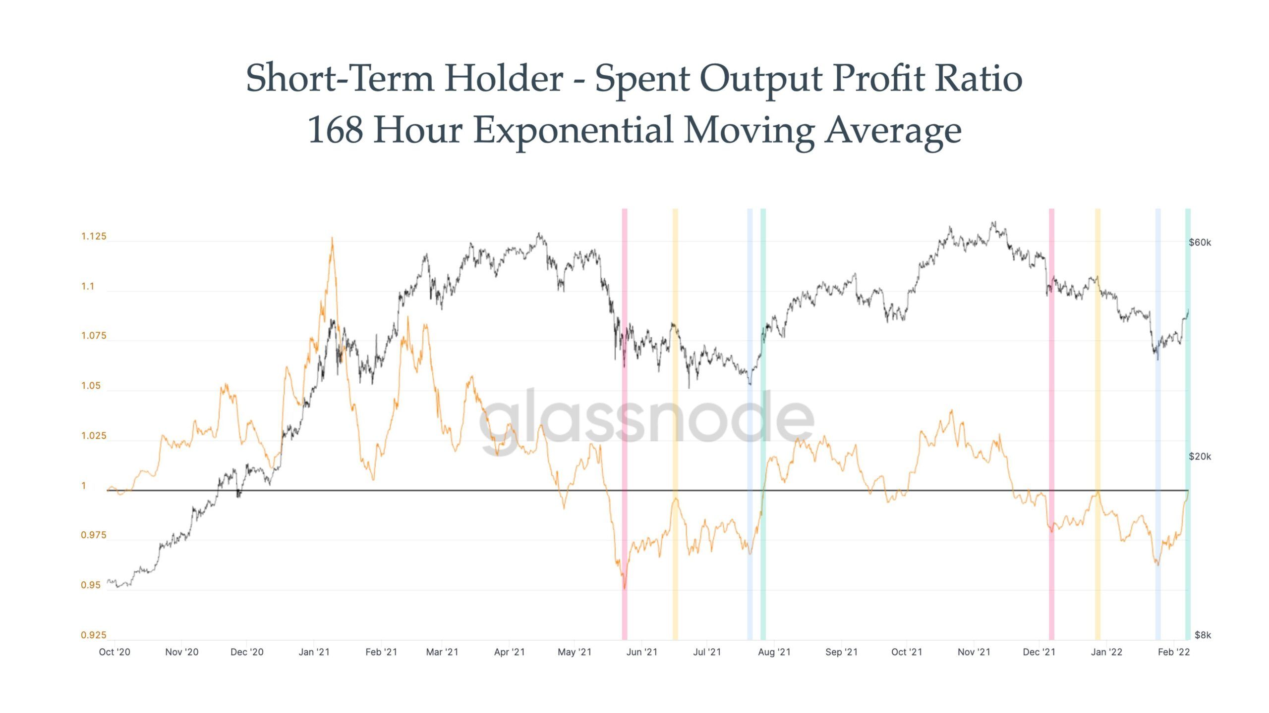 Pomimo interesujących wydarzeń na powyższych wykresach, najciekawiej wygląda dziś SOPR krótkoterminowych posiadaczy. Przeciwnie do poprzedniego wskaźnika bierze on pod uwagę tylko transakcje aktywów, które ostatnio poruszyły się w okresie krótszym niż 155 dni.