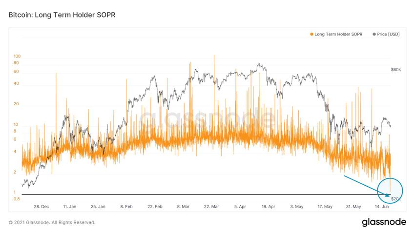 Również dla długoterminowych hodlerów SOPR spada i prawie osiągnął linię 1. Oznacza to, że nawet hodlerzy stają się niecierpliwi i sprzedają po niskich cenach, nieco powyżej progu rentowności.