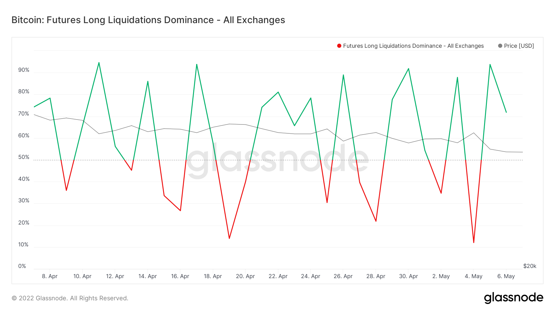 Istnieje jeszcze inny, interesujący wskaźnik, który dobrze pokazuje jak bardzo dzisiejsza sytuacja przypomina boczny rynek kraba. Jest to tzw. dominacja likwidacji długich pozycji na kontraktach terminowych (Futures Long Liquidations Dominance).