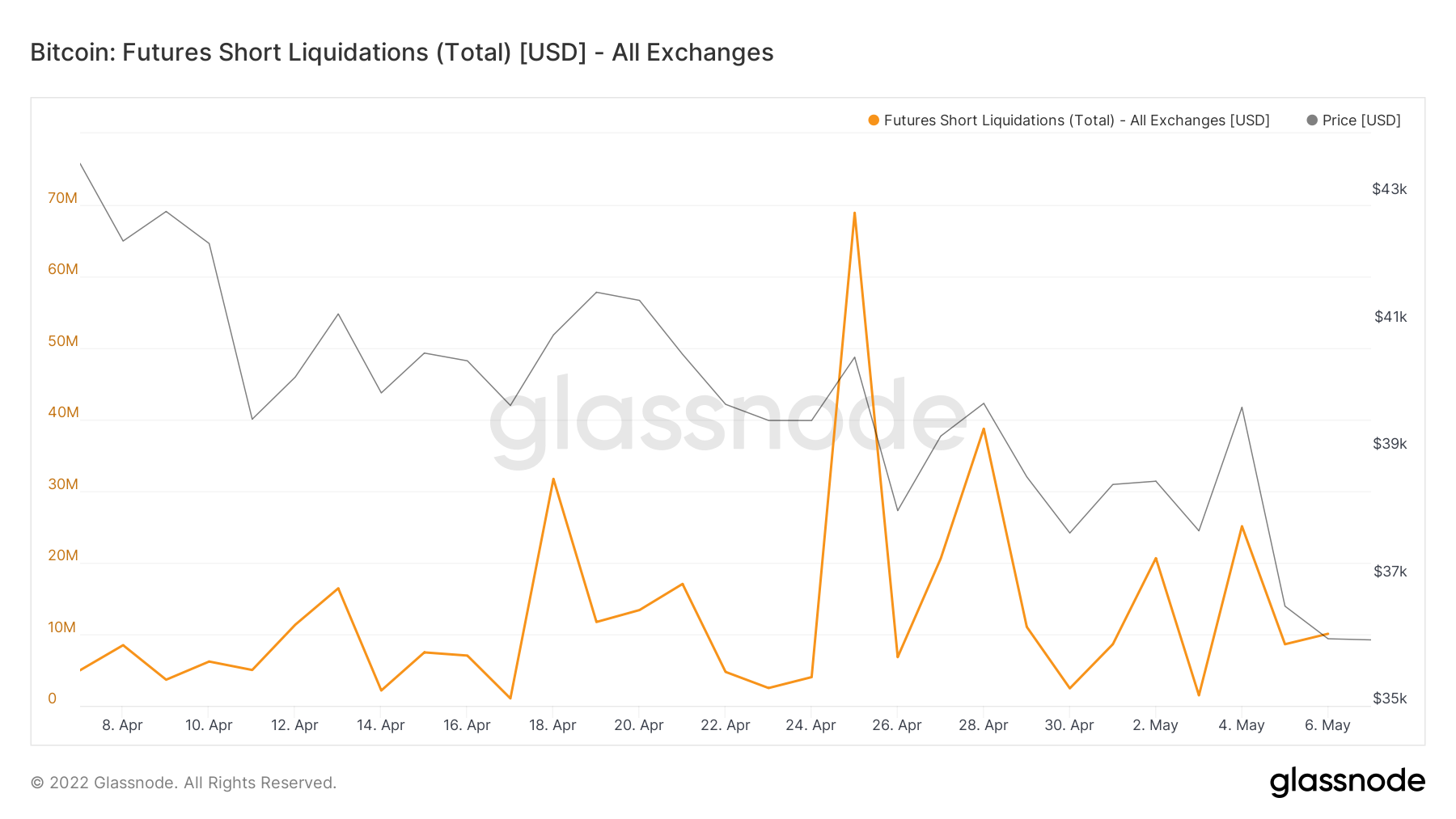 Według danych z CoinGlass tego dnia odnotowano likwidacje krótkich pozycji na poziomie 45,5 mln USD. Natomiast według Glassnode likwidacje shortów wyniosły 25 mln USD. Warto dodać, że w traderzy obstawiający spadki ostatnio ponieśli większe straty w dniu 25 kwietnia, gdy BTC wybił się powyżej 40 000 USD.