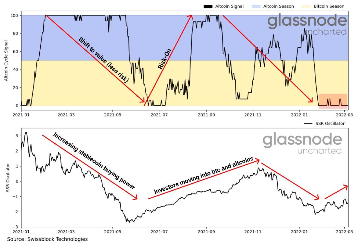 W dzisiejszej analizie on-chain BeInCrypto zestawia wskaźnik Stablecoin Supply Ratio (SSR) i jego oscylatorowi z wykresem kapitalizacji rynkowej altcoinów. Celem jest próba określenia, czy należy oczekiwać nadejścia pierwszego w 2022 roku altcoin sezonu.