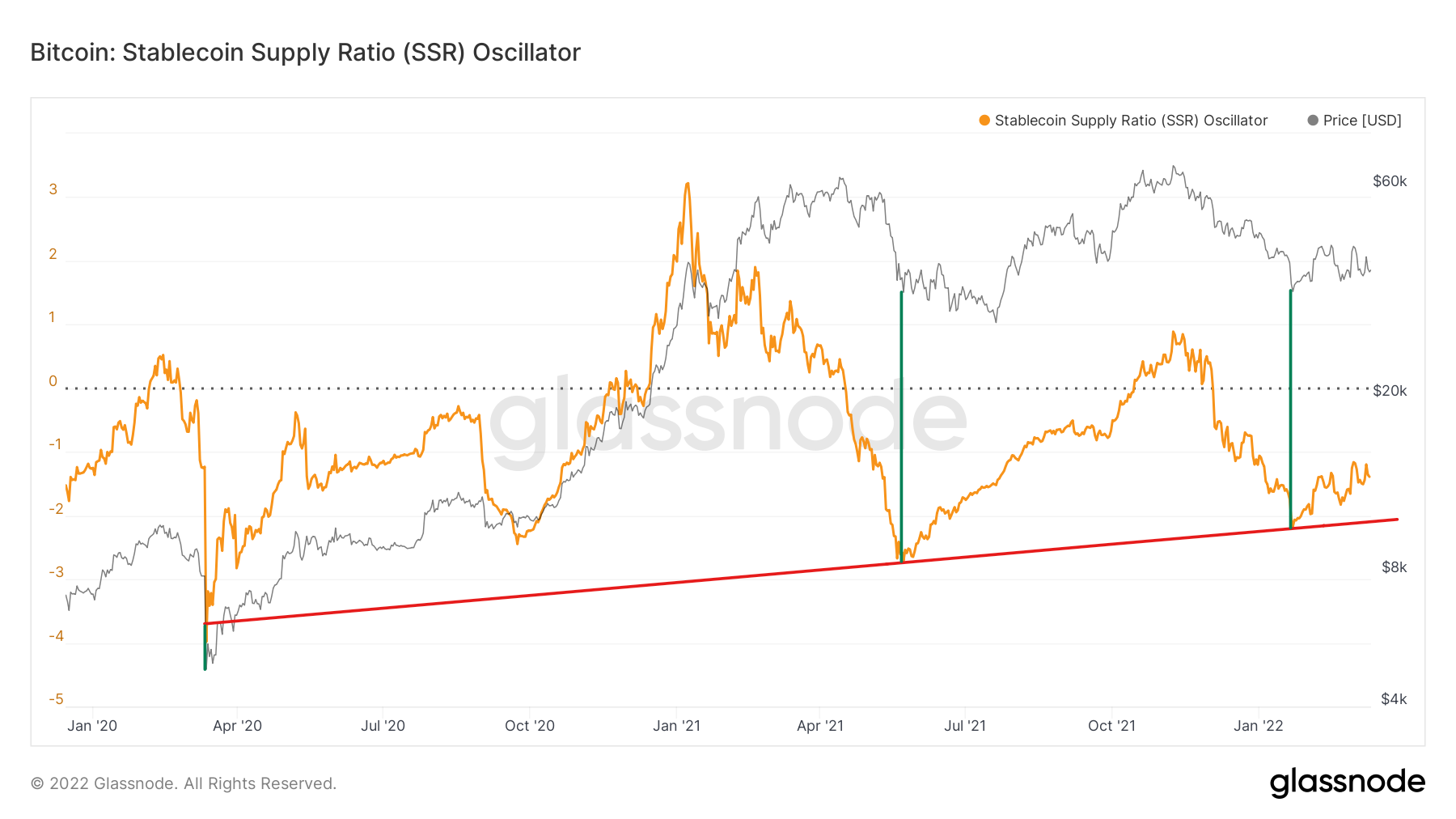 Na wykresie oscylatora SSR od Glassnode istotnie dostrzegamy rosnącą linię wsparcia, która sięga krachu w wyniku pandemii COVID-19 w marcu 2020 r. Dotknięcie tej linii wsparcia korelowało z dołkiem ceny Bitcoina.