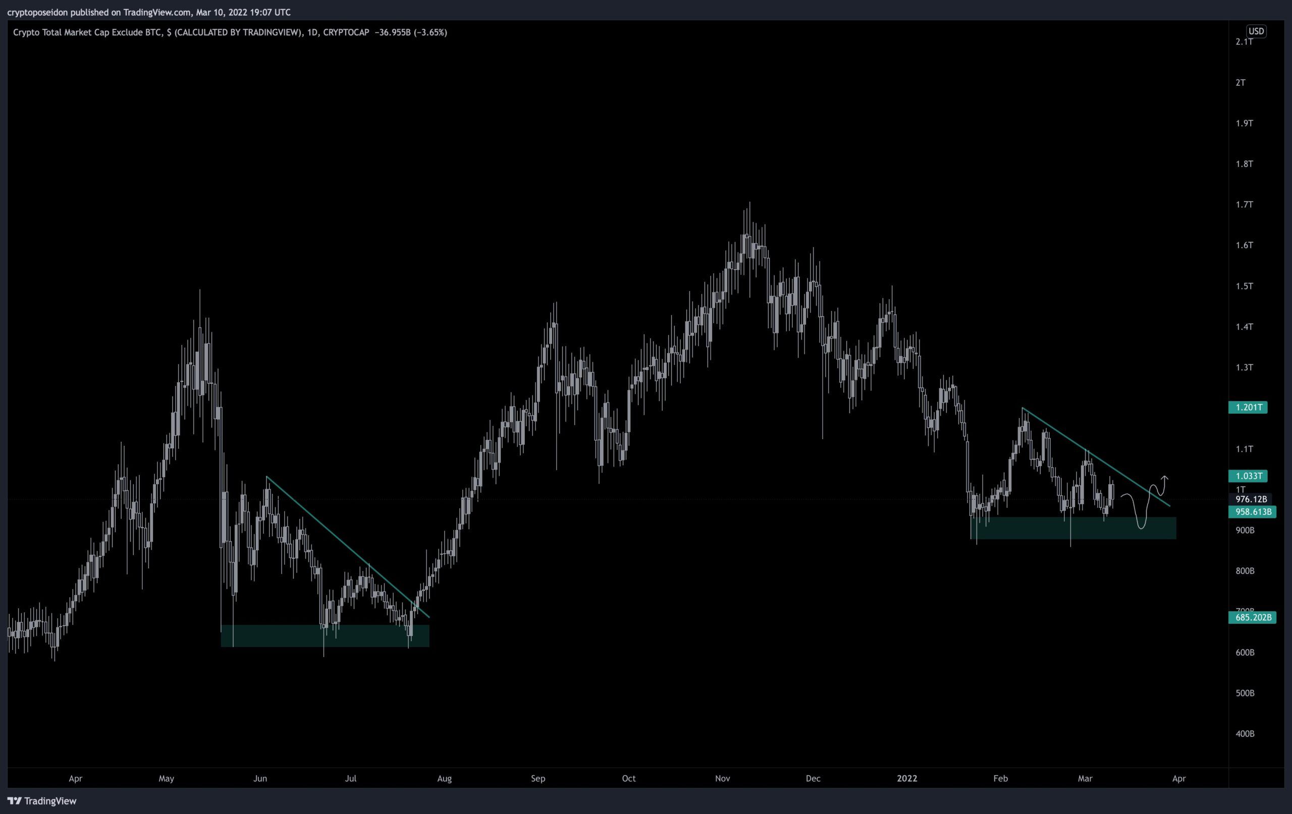 Trader kryptowalutowy @CryptoPoseidonn opublikował na Twitterze wykres TOTAL2, wskazując na możliwe duże wybicie. Porównuje on korektę z lata 2021 r. z bieżącą sytuacją. Trader spodziewa się, że przebicie opadającej linii oporu, a następnie jej zatwierdzenie jako wsparcia, doprowadzi do nowego altcoin sezonu.